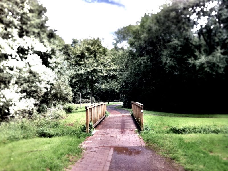 ... C'est le trajet que je fais pour aller jusqu'au tram. Je vous ai déjà dit que je vis dans une rue on ne peut plus résidentielle (pour pas dire chiante) ? Et bien dans cette rue et à deux pas de chez moi, il y a une église. Et derrière cette église commence un parc, assez grand, qui mène directement à l'arrêt du tram. C'est champêtre et buccolique, et tout mignon, et ça réveille mon amour de la nature. J'aime bien les parcs qui sont près de chez moi (et ils sont nombreux) parce qu'il y a un vrai effort d'entretien, et plein de choses disponibles, comme des jeux pour enfants, mais aussi des bacs de saut en longueur, des tables de ping pong, des pistes de course, des paniers de basket et j'en passe.